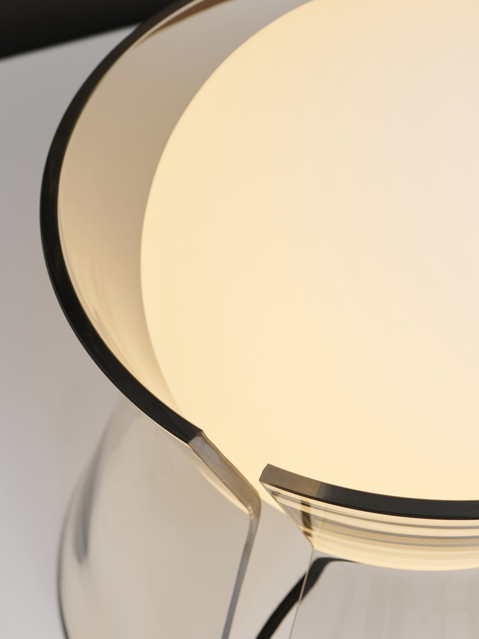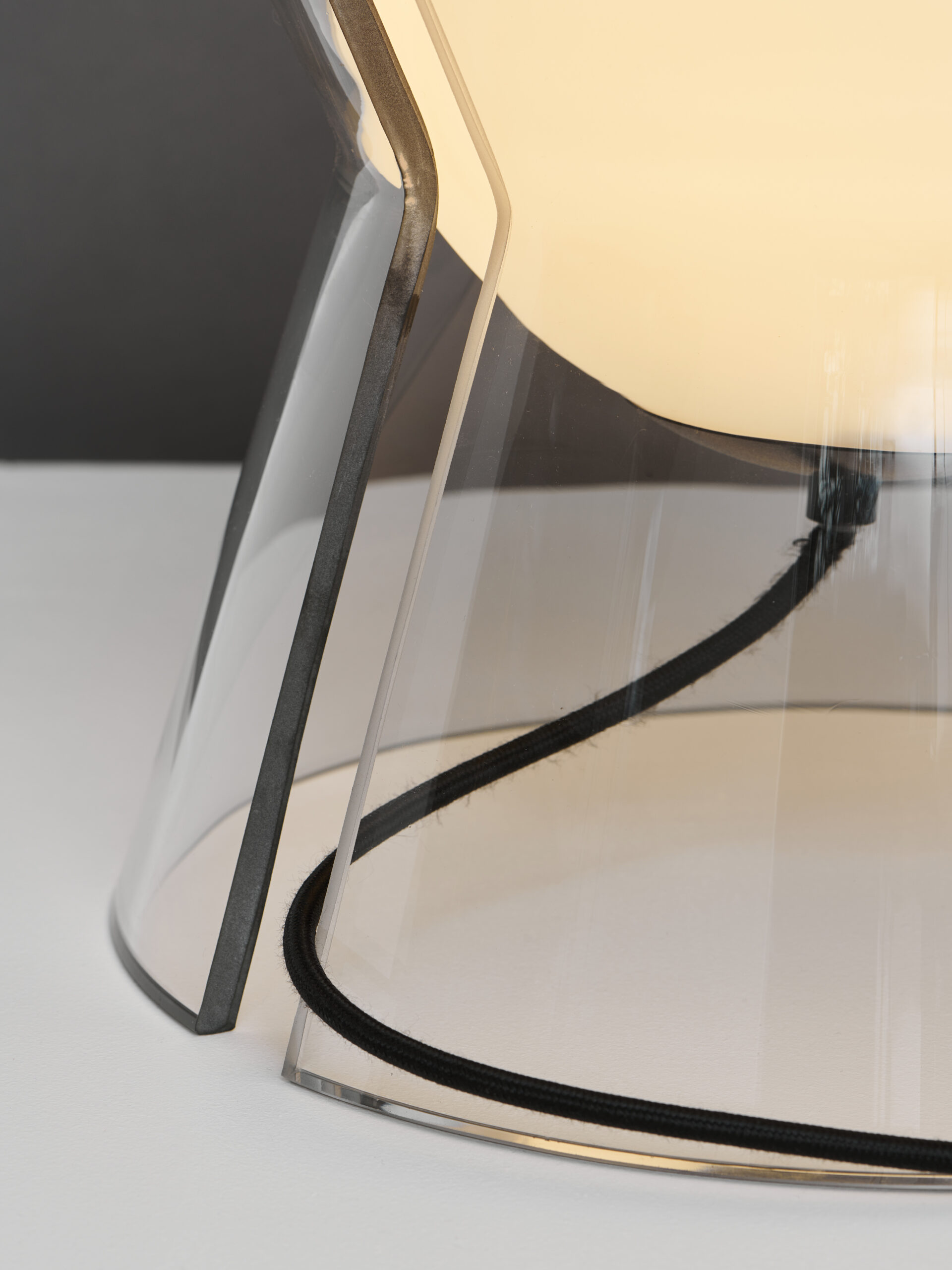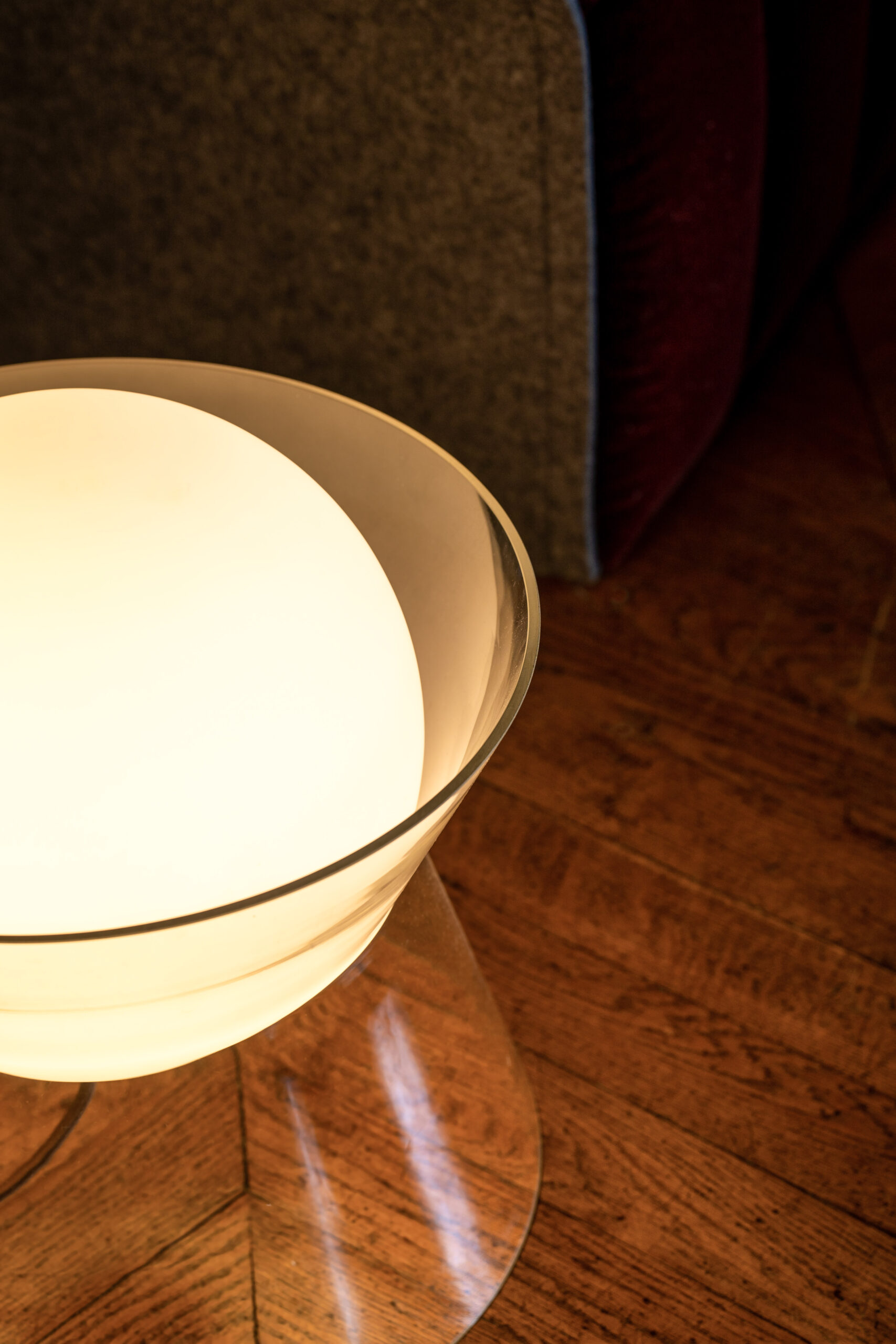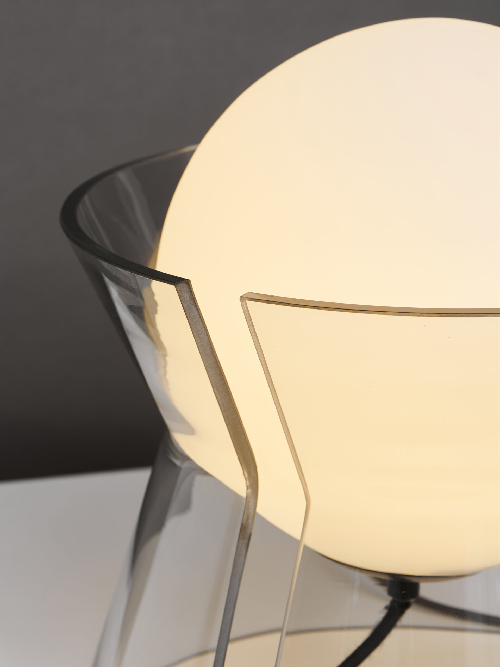 Eine mundgeblasene Glaskugel scheint schwerelos über einem konischen Sockel aus transparentem Glas zu schweben. Die Leuchte lebt vom präzisen Zusammenspiel aus Material, Licht und Proportion und entwickelt ihre Wirkung aus der Reduktion auf das Wesentliche.