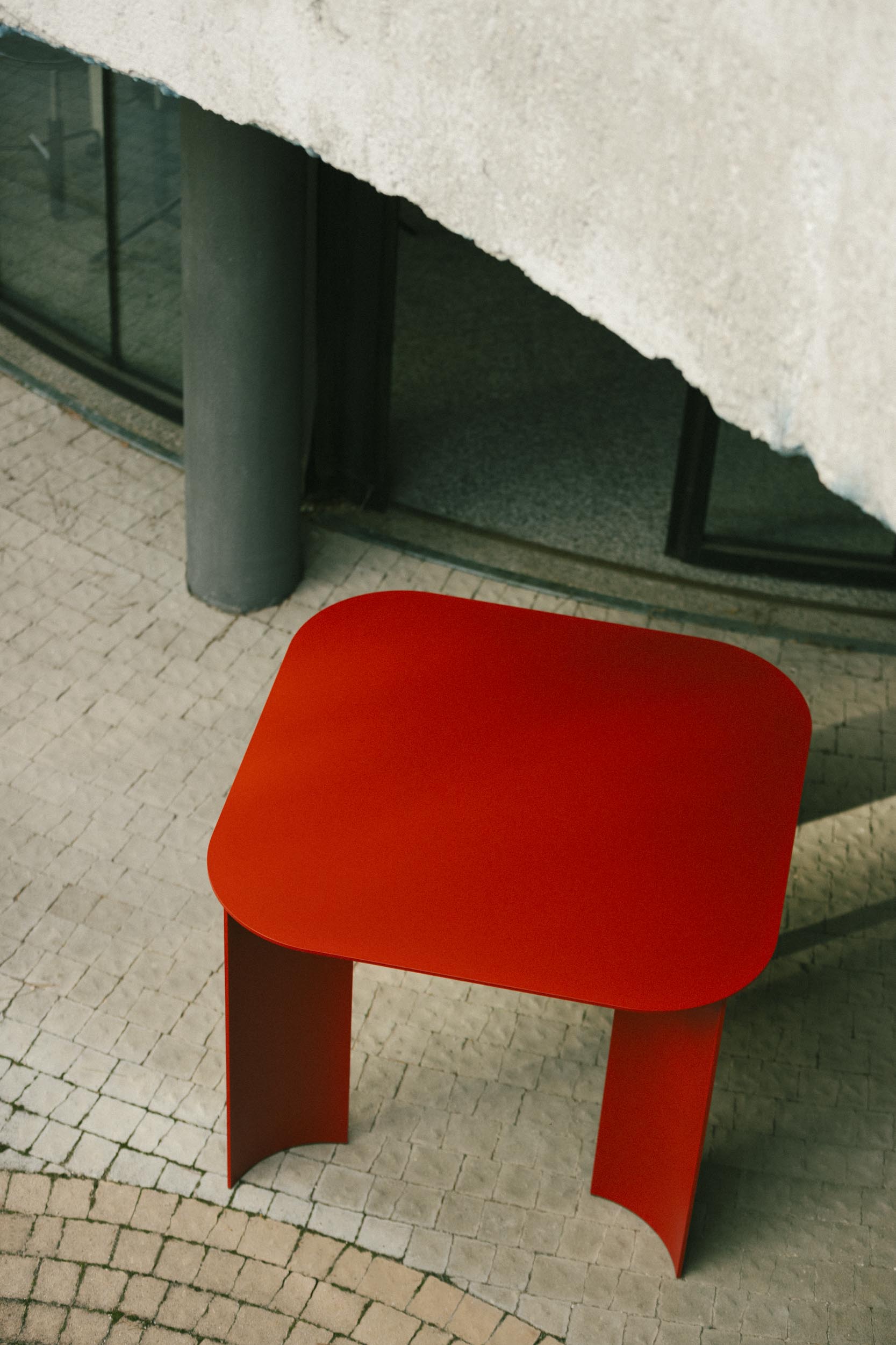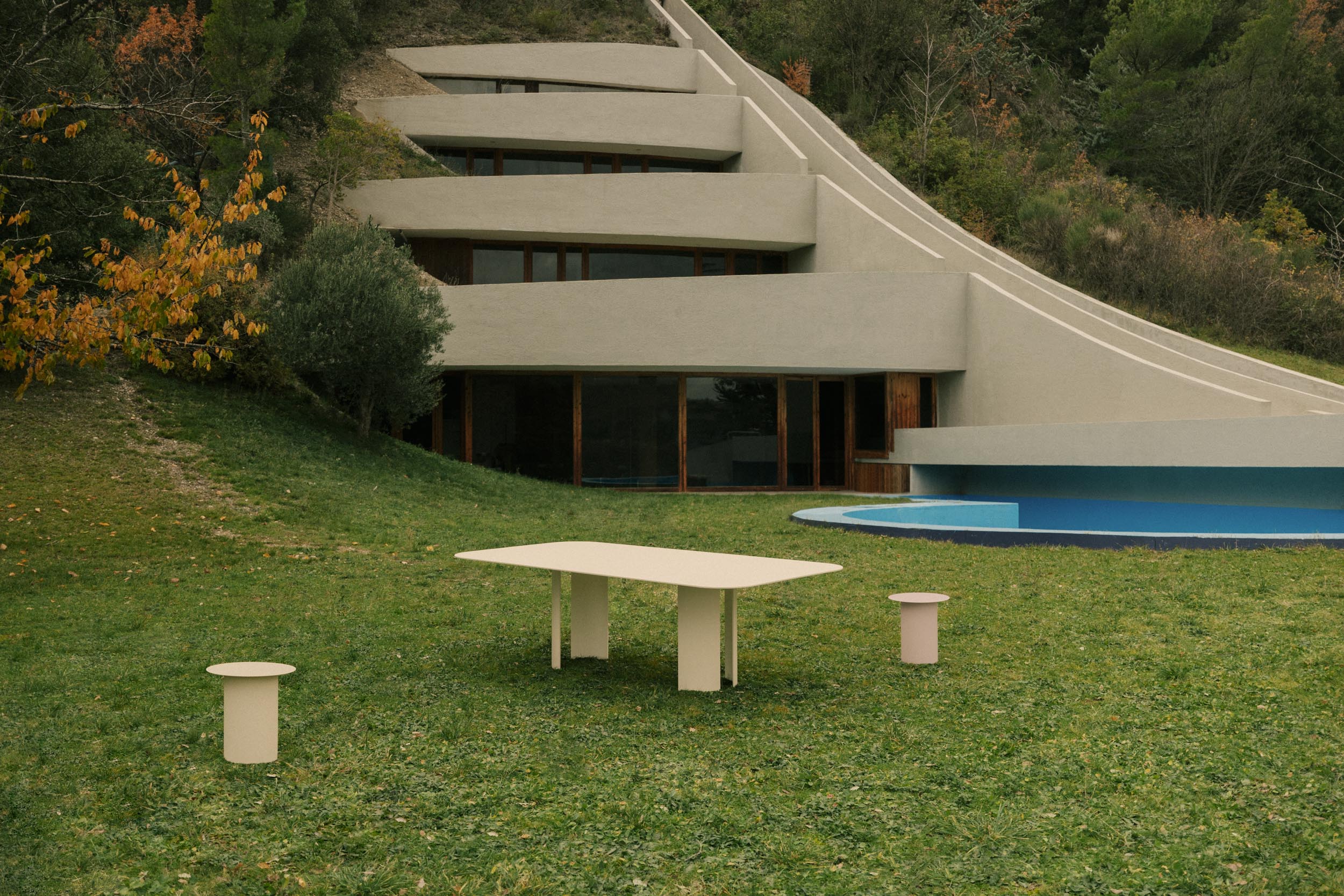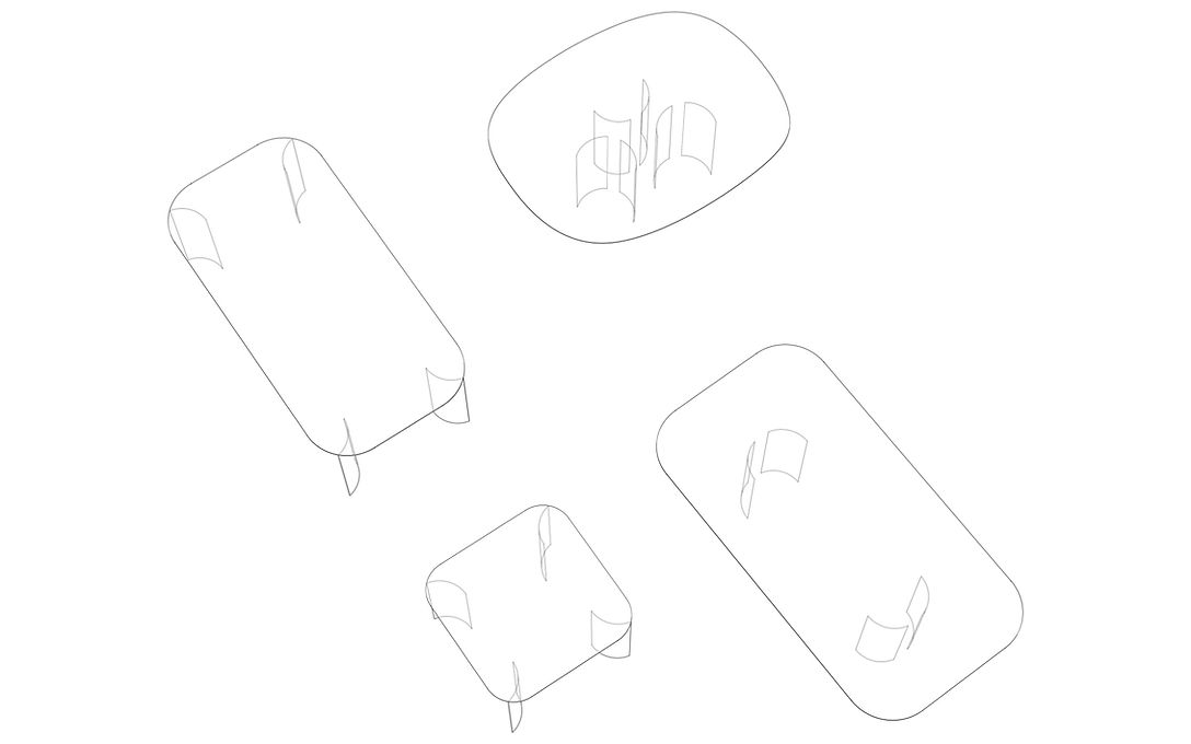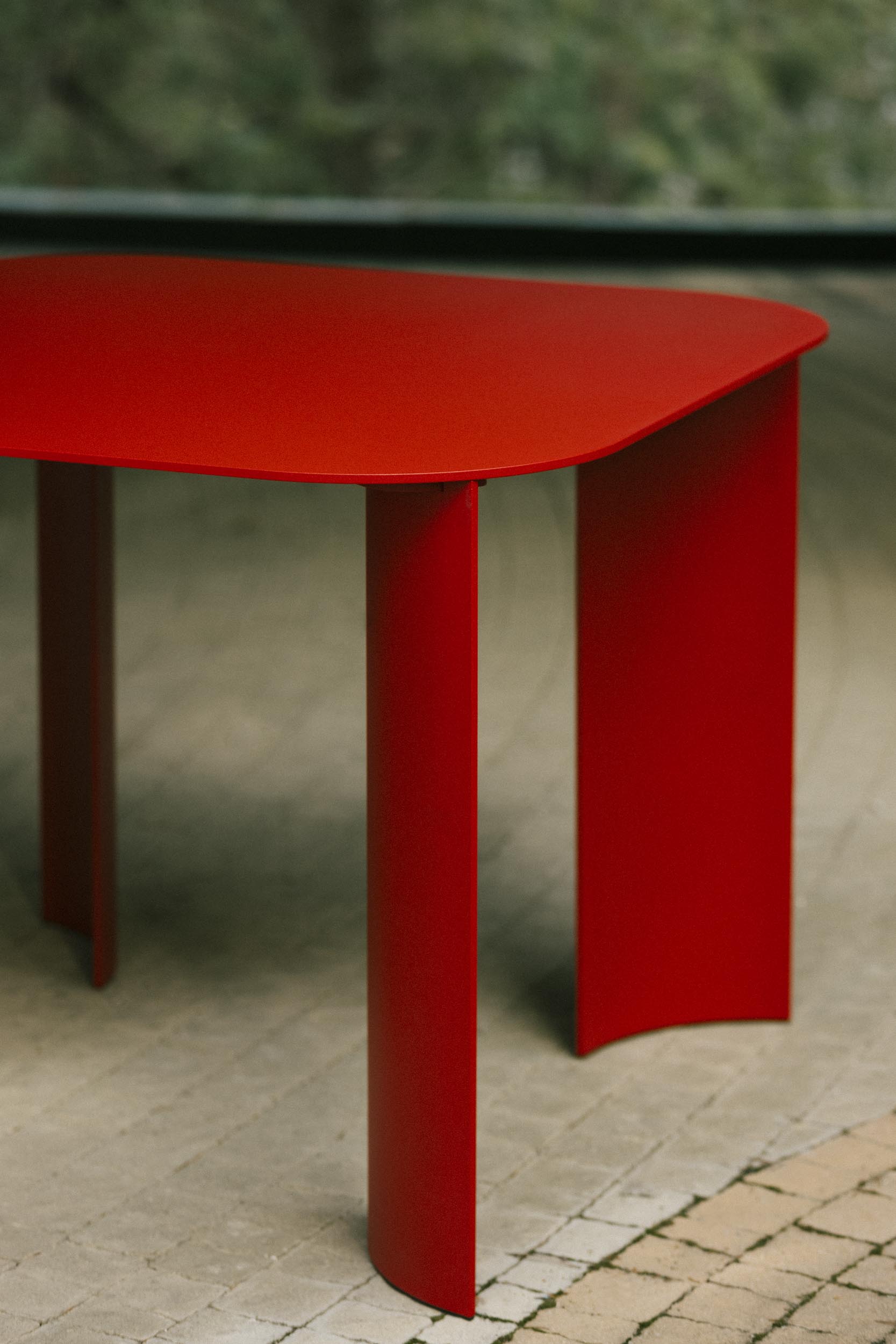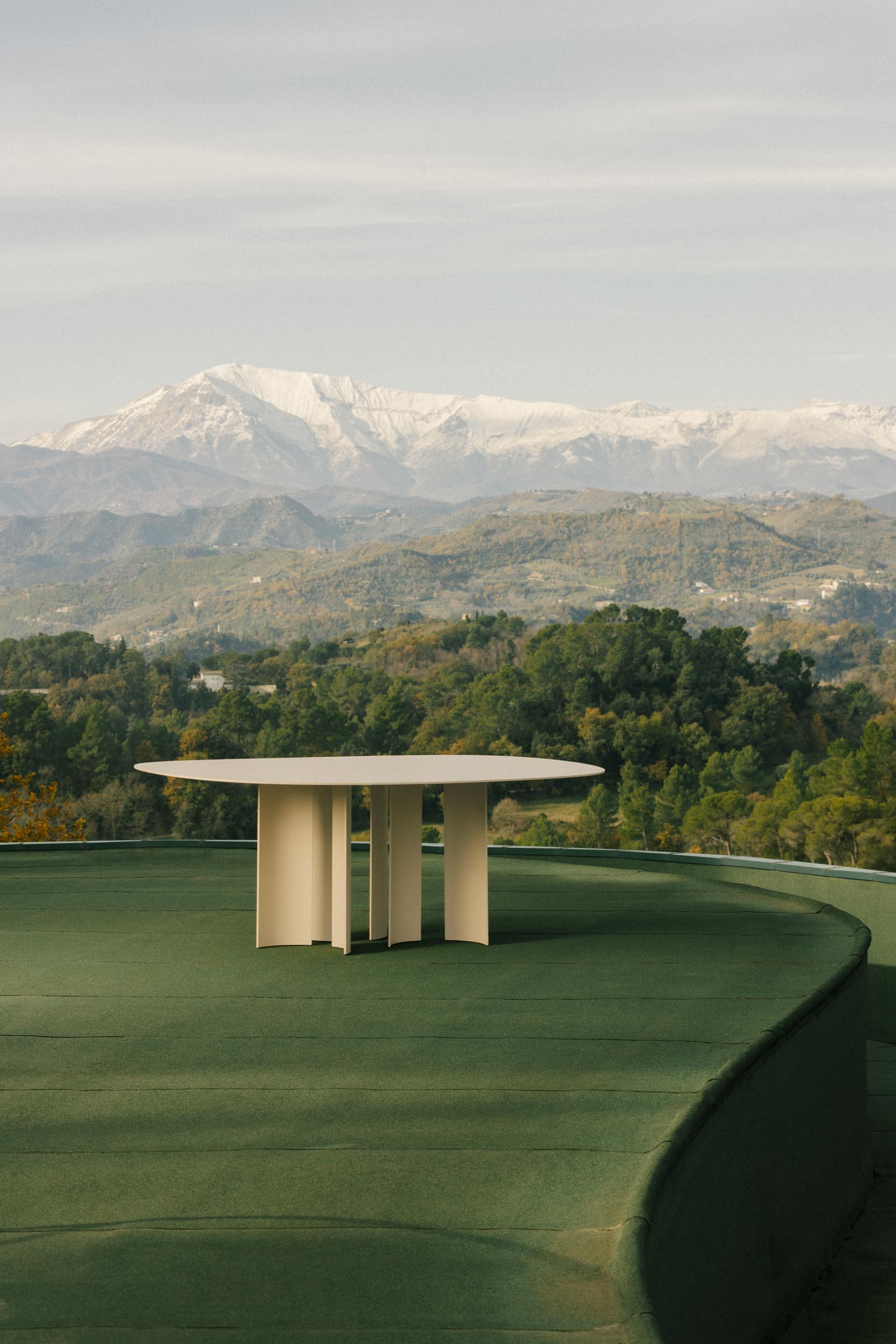 Die vier Metallbeine, kalt zu einer charakteristischen Viertelkreisform gebogen, bilden die konstruktive Grundlage des Tisches. Sie sorgen für strukturelle Stabilität und erzeugen zugleich eine offene, einladende Präsenz. Die Gestaltung bleibt bewusst reduziert und lässt Raum für Nutzung, Begegnung und Kontext.