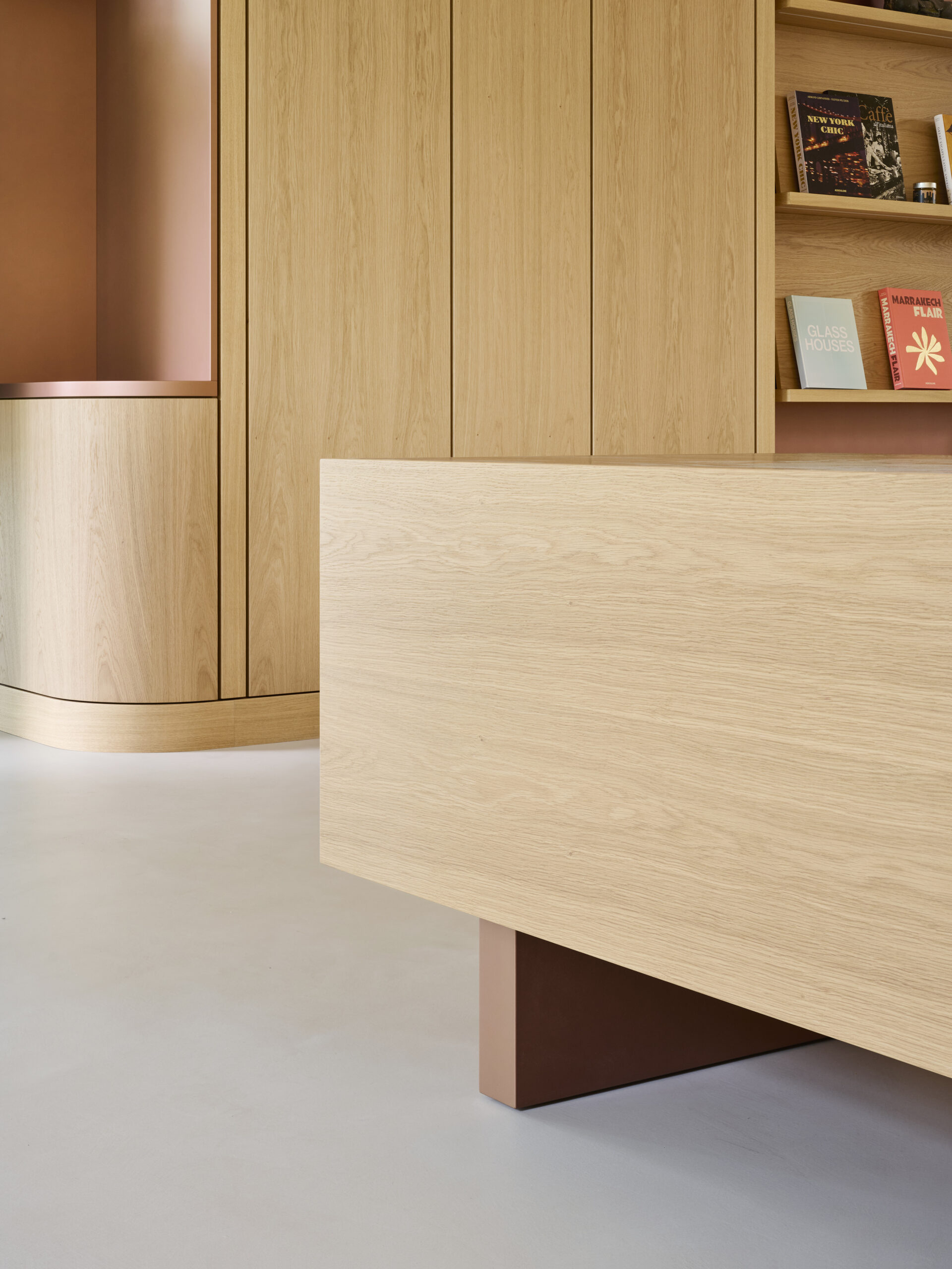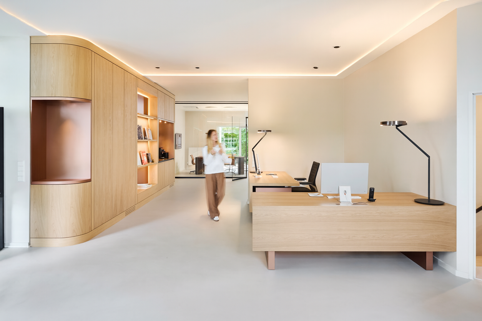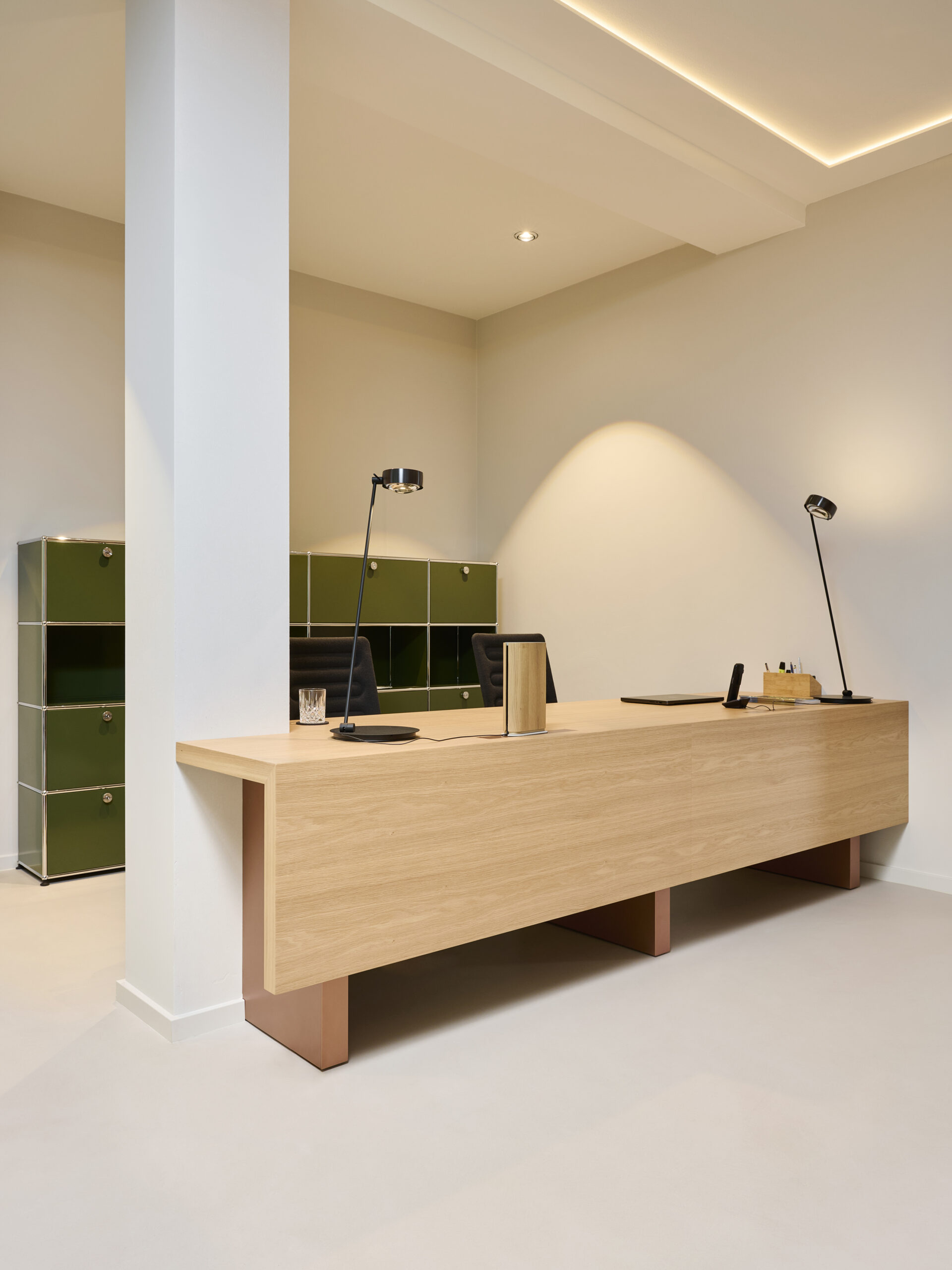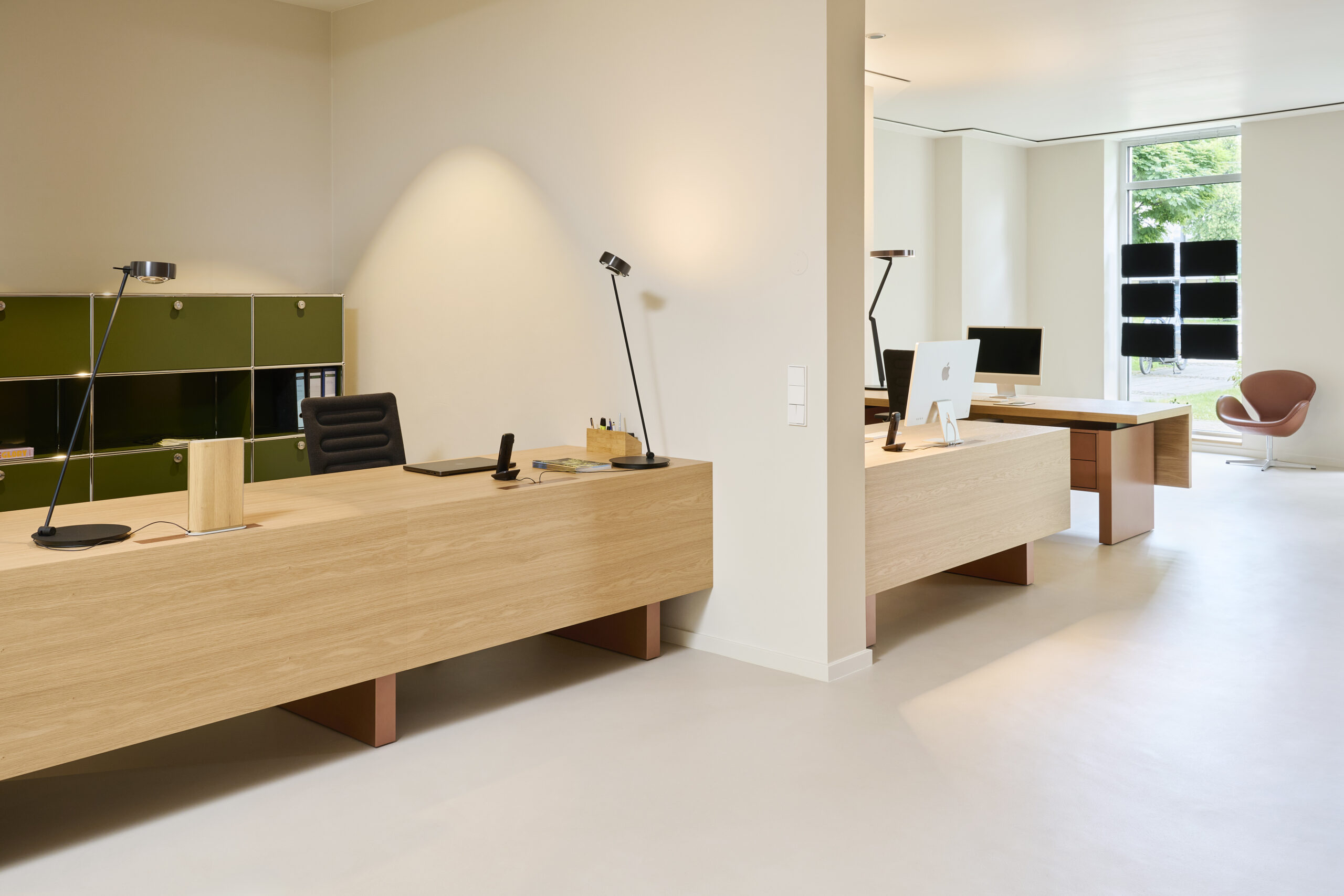 Im Zentrum des Raumes stehen die maßgefertigten Schreibtische: ruhige, monolithische Volumen aus hellem Eichenholz, die auch bei Schränken und Garderoben Verwendung finden. Sie treten in einen bewussten Dialog mit strukturellen Metalldetails und schaffen ein ausgewogenes Verhältnis zwischen der warmen Materialität des Holzes und der klaren, essenziellen Präzision des Metalls.