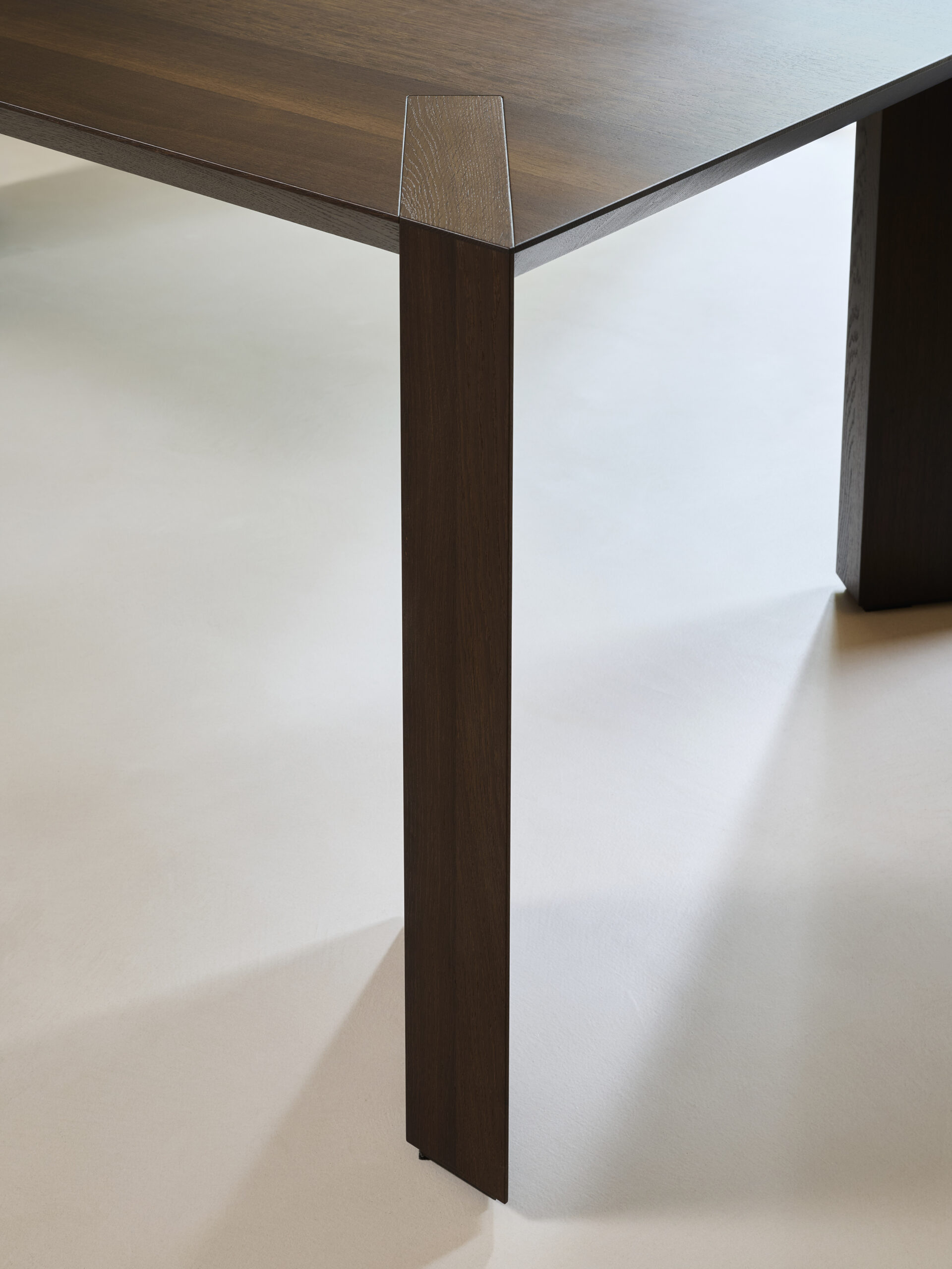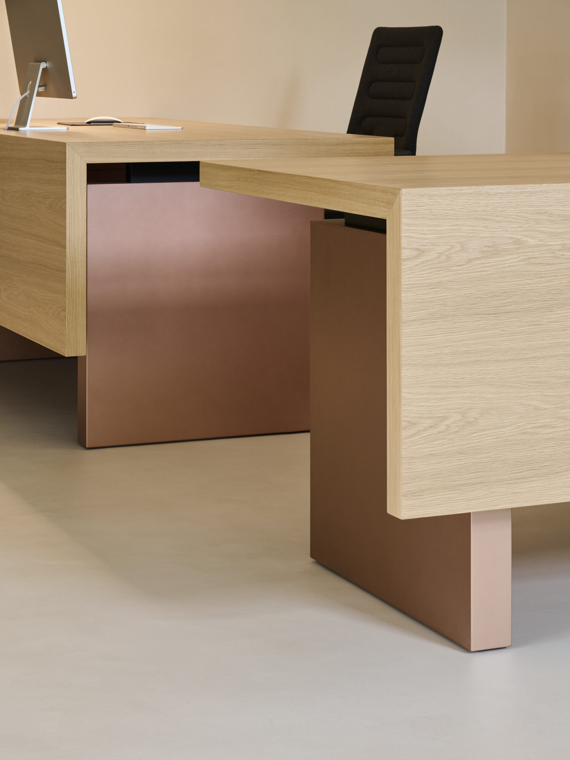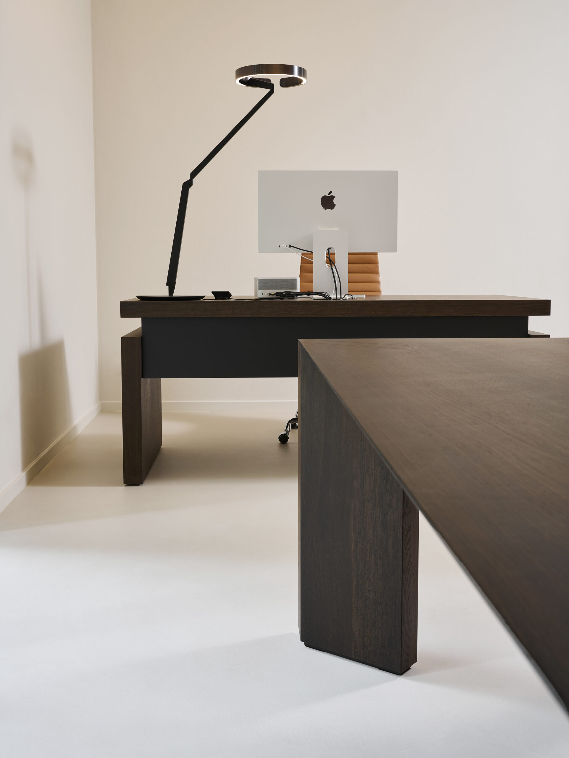 Der Besprechungsraum wird von einem großzügigen Konferenztisch aus geräucherter Eiche geprägt, dessen schräg gestellte Beine ihm eine skulpturale Präsenz verleihen. Die Schreibtischplatte des Büroleiters, ebenfalls aus Räucher-Eiche, scheint über massiven Holzfüßen zu schweben und unterstreicht den architektonischen Charakter des Raumes.
