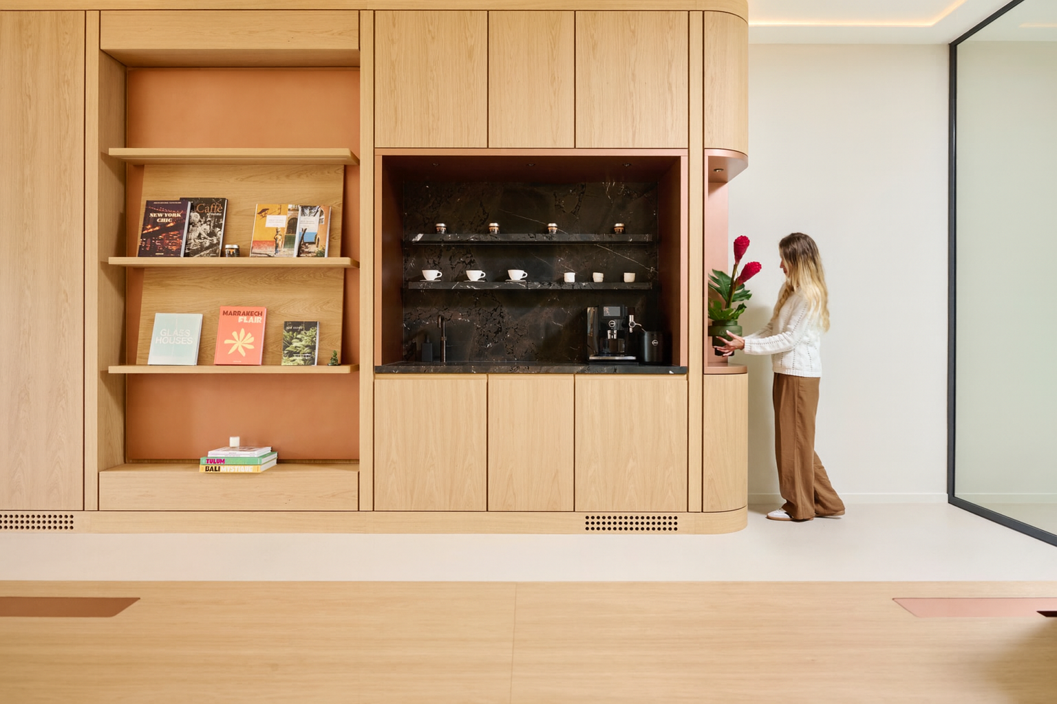 Metall in bronzefarbener, satinierter Ausführung setzt präzise Akzente und bildet einen spannungsvollen Kontrast zu den warmen Oberflächen. Der Naturstein Breccia Imperiale verleiht der integrierten Barzone eine zurückhaltende Eleganz.