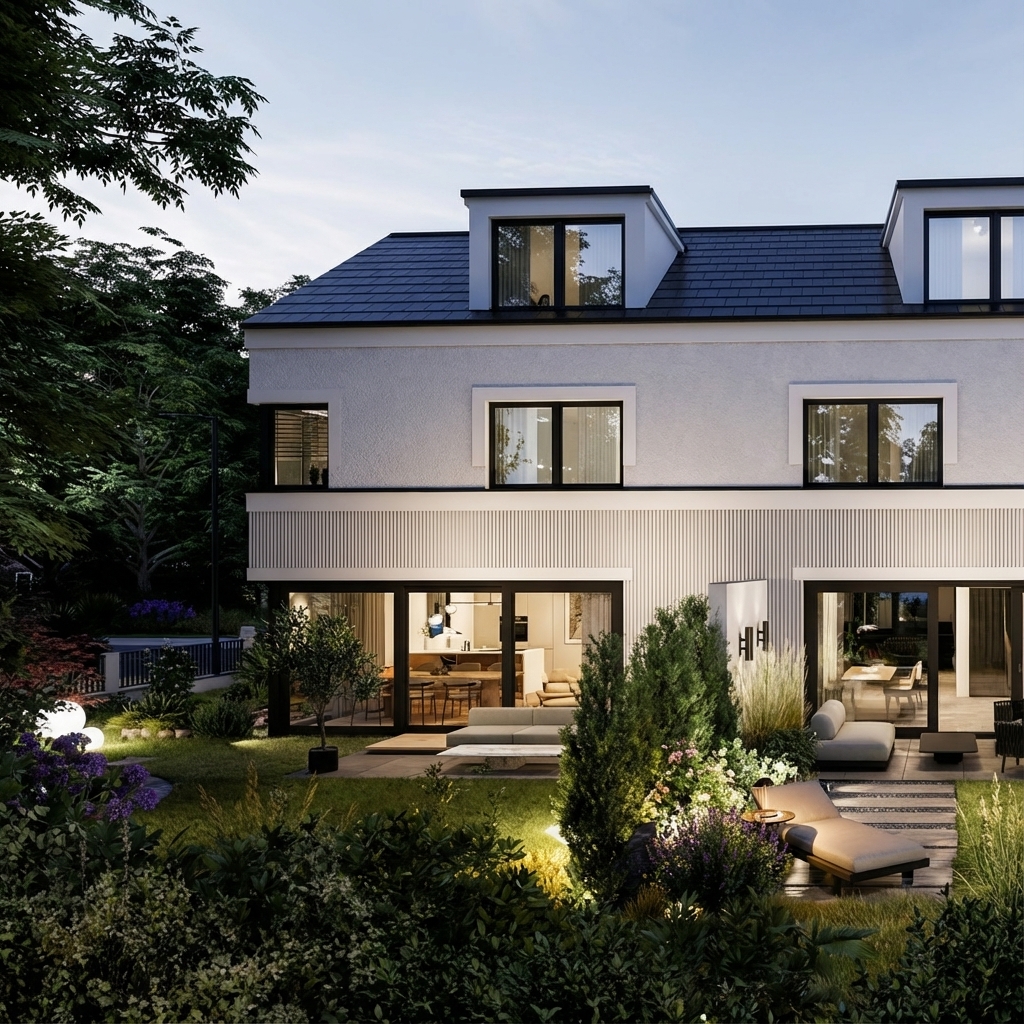 Der architektonische Entwurf interpretiert das klassische Stadthaus in zeitgemäßer Form. Sorgfältig proportionierte Fensterflächen, strukturierter Kammputz und fein abgestimmte Kontraste prägen das äußere Erscheinungsbild. Die klare Fassadengliederung verleiht dem Gebäude eine ruhige Präsenz und unterstreicht den exklusiven Charakter des Neubaus.